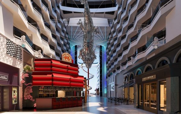 Fra le altre, la compagnia segnala la scultura del drago: una scultura in acciaio inox raffigurante un drago, sospesa a 10 metri di altezza sopra la World Promenade. E ancora, The Spiral @ Tree of Life: destinato a diventare lo scivolo più lungo mai realizzato in mare, con 81,3 metri di lunghezza, questo elemento architettonico distintivo delle navi World Class offrirà una discesa emozionante tra 12 ponti in pochi secondi.