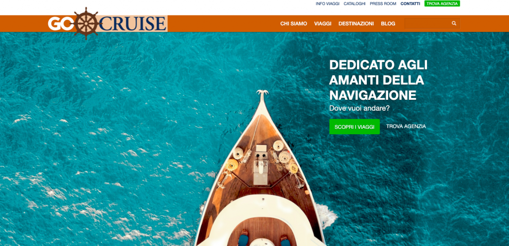 Nuovo cluster per la famiglia Go World: Go Cruise è pensato per chi ama viaggiare sull’acqua e offre tra l’altro crociere fluviali su lussuose navi Avalon per scoprire il Reno e il Danubio percorrendo le tappe più belle del Nord Europa, crociere Star Clipper nel mar Mediterraneo, noleggio di yacht quali il Ferretti Cl 97 o l’Aicon 56 Flybridge, per scoprire le isole Eolie e le Egadi in 14 giorni, o il noleggio di imbarcazioni a vela per vacanze uniche.