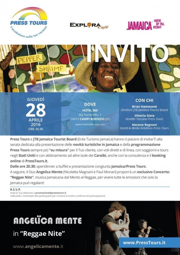 Press Tours, in collaborazione con Jamaica Tourism Board, invita le agenzie di viaggio a scoprire tutte le novità in destinazione e la programmazione Press Tours in Jamaica e nell’arcipelago caraibico anche con itinerari via Stati Uniti, per offrire al cliente viaggi sempre più “su misura” sia con voli diretti che di linea, anche con la consulenza del booking online PressTours.it e le garanzie Press Tours a tutela del professionista e del consumatore. La serata prevede dalle ore 20.30 aperidinner a buffet e a seguire presentazione e, in esclusiva, il Concerto Jamaicano “Reggae Nite” degli Angelica Mente (Nicoletta Magnani e Paul Monari) il prossimo giovedì 28 aprile a Firenze (Campi Bisenzio) presso Hotel 500. Per aderire alla serata inviare una mail a promozione@presstours.it con i nomi/cognomi dei partecipanti e il recapito dell’agenzia; si riceverà poi una mail di conferma.