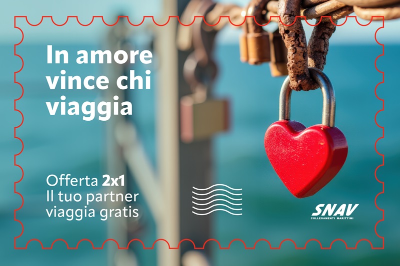 Una promo 2×1 dedicata a tutti gli innamorati. Per chi prenota entro il prossimo 15 febbraio, Snav permette permette di viaggiare in due e pagare un solo biglietto. Le mete proposte comprendono le isole Eolie, Ponza e Ventotene, nonché la Croazia.