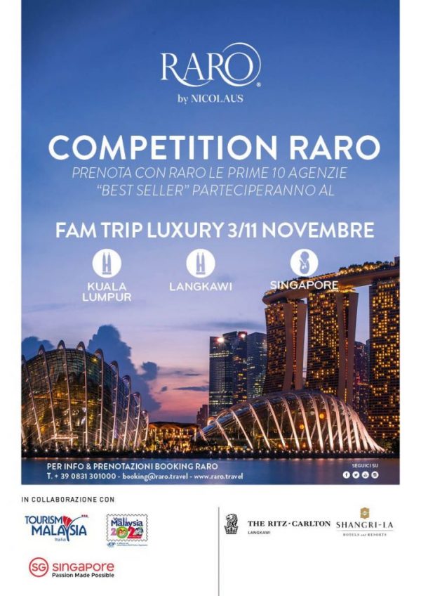 Entra nel vivo Raro Competition, il contest di Raro by Nicolaus riservato alle agenzie di viaggio. Organizzata in collaborazione con Singapore Tourism Board e Malaysia Tourism, l’iniziativa premia le agenzie che hanno prodotto i risultati migliori con un fam trip top level, creato per far vivere ai partecipanti un’autentica esperienza in stile Raro, del tutto identica a quella sperimentata dai clienti. Il termine ultimo per conteggiare il valore complessivo delle pratiche confermate è previsto per il 15 ottobre: dieci saranno le agenzie coinvolte dal 3 all’11 novembre 2018 in un viaggio che toccherà Singapore e la Malesia, con una tappa sulla spettacolare arcipelago di Langkawi. La decisione di organizzare una Raro Competition incentrata su Malesia e Singapore – come sottolinea Vito Facciolla, product manager Raro by Nicolaus – è strategica per il potenziamento dei numeri di queste mete in grande crescita, grazie anche a uno stretto lavoro di collaborazione con gli enti, i vettori aerei e le Dmc locali. «Siamo felici di proseguire la collaborazione con Raro con questa nuova iniziativa, che siamo certi avrà ottimi riscontri sul mercato. Gli agenti di viaggio sono fondamentali per far scoprire ai viaggiatori le bellezze della Città del Leone: visitare Singapore e toccare con mano l’offerta della destinazione sarà sicuramente uno stimolo in più per proporla ai propri clienti» commenta Brigitte U. Fleischauer, area director Central & Southern Europe Singapore Tourism Board. «Siamo ben felici di questa collaborazione con Raro, con la certezza che i risultati saranno più che buoni. E il Fam Trip che accoglierà gli agenti migliori si può a ben diritto definire una chicca: nomi come The Ritz Carlton Langkawi, Exo Travel Tour Operator, Shangri-la, Singapore Airlines sono indicatori del livello di qualità di questo viaggio» aggiunge Vincenza Andreini, marketing & pr consultant di Tourism Malaysia.
