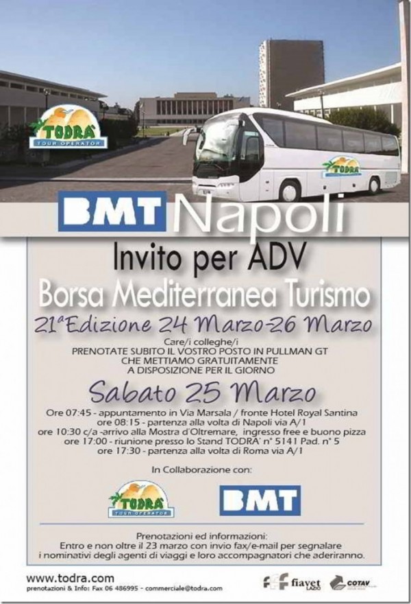 Il tour operator Todrà invita tutti gli agenti di viaggio a raggiungere la Borsa mediterranea del turismo di Napoli con un pullman Gt messo a disposizione per raggiungere la fiera nella giornata di sabato 25 marzo con partenza da Roma. L’appuntamento è alle 7.45 in via Marsala, di fronte all’hotel Royal Santina, la partenza è alle 8.15 con arrivo previsto alla Mostra d’Oltremare di Napoli alle 10. Entrata libera e buono pizza a disposizione dei partecipanti. Alle 17 appuntamento allo stand Todrà (n. 5141 al padiglione 5) per rientrare a Roma con partenza alle 17.30. Prenotazioni entro il 23 marzo tramite email all’indirizzo commerciale@todra.com/cinzia@todra.com per segnalare i nominativi degli agenti partecipanti e di eventuali accompagnatori.