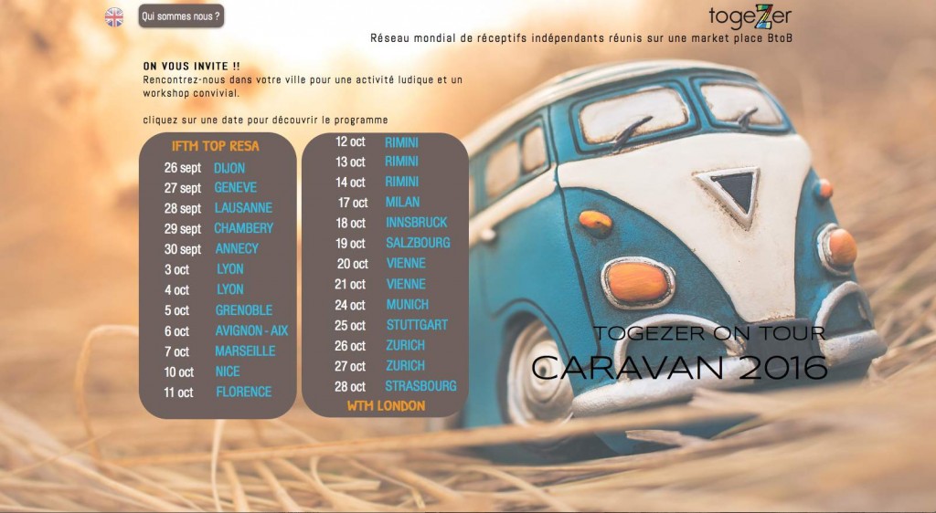 TogeZer sbarca in Italia. Il progetto prevede il raggruppamento a livello mondiale di dmc – al momento circa 80 – che inseriscono la loro proposta all’interno di un portale b2b dedicato a tutti i tour operator e agenti di viaggio che vogliono organizzare un itinerario ad hoc. TogeZer mette in relazione diretta attraverso la piattaforma b2b una selezione di ricettivisti di qualità con tour operator e adv, attraverso uno spazio online che si propone di creare un proficuo rapporto di collaborazione all’insegna della tecnologia. Connettendosi alla piattaforma, agenzie e tour operator avranno accesso ai prodotti che le varie dmc hanno sviluppato sul campo. Lo scorso 26 settembre è partito “Caravan”, un roadshow ad hoc che attraverserà l’Europa per presentare le potenzialità di TogeZer. Dopo la Francia, tappe in Svizzera e passaggio dall’Italia a Firenze (11 ottobre), Rimini (durante Ttg, 12, 13 e 14 ottobre) e Milano (17 ottobre) per proseguire con Austria e Germania e chiudere al Wtm di Londra (www.togezer.travel/caravane-2016).