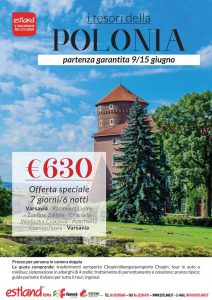Estland, tour operator specializzato sull’Europa dell’est, propone il tour “I tesori della Polonia” con partenza garantita 9/15 giugno di sette giorni e sei notti. L’itinerario parte da Varsavia e tocca mete come Czestochowa, Auschwitz e Cracovia. Quota di 630 euro con guida parlante italiano, sistemazione in hotel 4 stelle, trattamento di pernottamento e prima colazione, pranzo tipico.