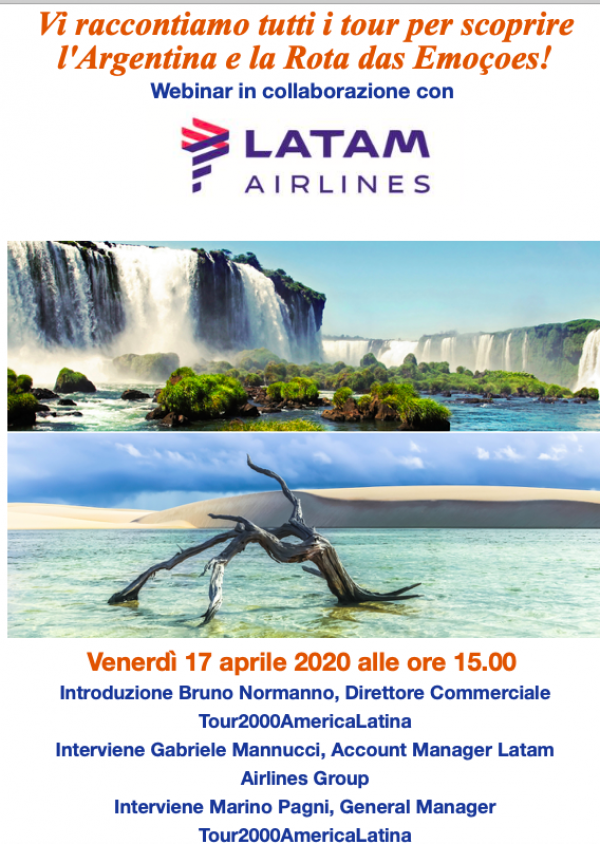Per iscriversi al webinar Argentina e Brasile con Latam Airlines scrivere un’email a segreteria@tour2000.it.