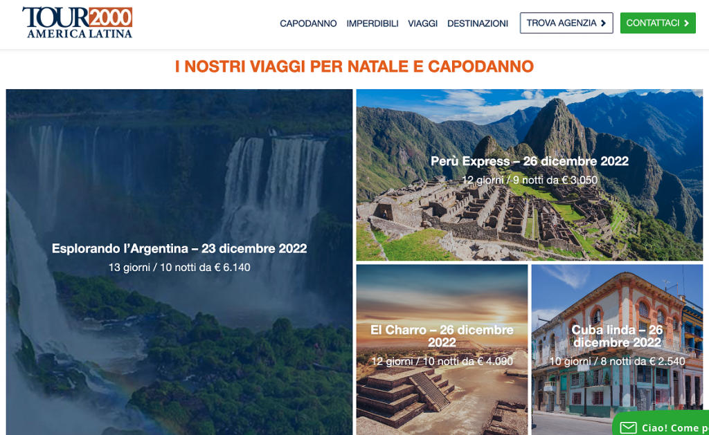 Partenze garantite a conferma immediata con voli e servizi inclusi. Sono le proposte Tour2000AmericaLatina della collezione Viaggi Imperdibili con le ultime opportunità disponibili per scoprire Argentina, Perù, Messico nel periodo di Capodanno. “I prodotti che abbiamo studiato propongono una rosa di tour indimenticabili nelle mete che ogni viaggiatore dovrebbe visitare nella parte centrale e meridionale del Nuovo mondo”, afferma Marino Pagni, general manager di Tour2000AmericaLatina.