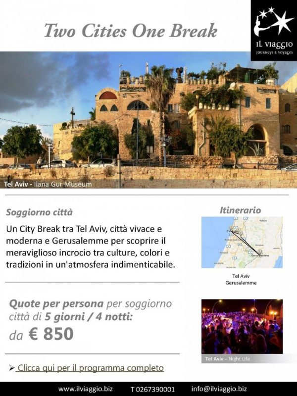 Fra il 15 aprile e il 31 dicembre 2017, Il Viaggio Journeys & Voyages propone un tour su base individuale in Israele, della durata di 5 giorni/4 notti. «Two Cities One Break – afferma Filippo Rossi, marketing manager de Il Viaggio Journeys & Voyages – prevede Gerusalemme, con la Città Vecchia, il Muro Occidentale, la chiesa del Santo Sepolcro e la Cupola della Roccia sul Tempio del Monte. Segue Tel Aviv con le sue spiagge, il divertimento notturno e i mercati esotici. Da non perdere il vicino porto di Jaffa, una delle città più antiche di Israele, teatro di importanti eventi storici per migliaia di anni. Le numerose attività proposte dalla destinazione ci permetteranno di personalizzare questo City Break in moltissime varianti: ci lasceremo guidare dalle preferenze dei nostri clienti». Il tour prevede una quota di 850 euro più volo internazionale, i dettagli sono disponibili sul sito de Il Viaggio Journeys & Voyages».