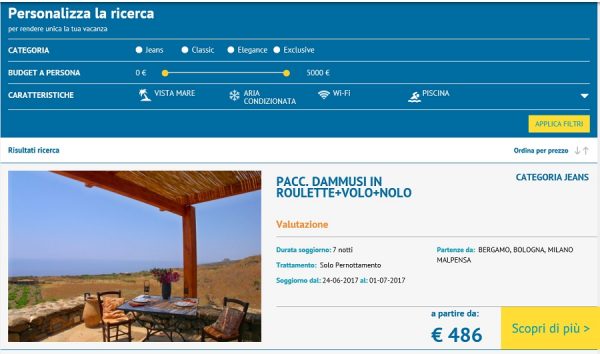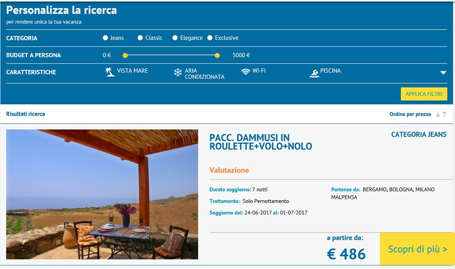 “Vivere Pantelleria”, tour operator incoming per l’isola di Pantelleria, da oggi è on-line con la sua nuova piattaforma di booking realizzata in versione “responsive” per consentire da qualunque dispositivo, sia esso tablet, pc o smartphone, la visualizzazione ottimizzata ed una facilità di navigazione maggiore rispetto al passato. Sul nuovo portale si potranno verificare le disponibilità in tempo reale ed il calcolo del prezzo per ogni servizio offerto, siano essi pacchetti (volo+soggiorno+noleggio) che escursioni o noleggi. La realizzazione della piattaforma è stata possibile grazie alla collaborazione ed il supporto di MM-One, che si è occupata della parte grafica e tecnica relativa al server, e di Zucchetti che ha invece sviluppato tutte le logiche di funzionamento interfacciandole perfettamente con il gestionale E-Agency dedicato alle Adv e T.O. «Siamo fieri del lavoro svolto – commenta Fabrizio Giglio, responsabile commerciale di Vivere Pantelleria – perché il nuovo booking con questo restyling grafico e funzionale si presenta user friendly e consentirà rispetto al precedente una più facile consultazione delle nostre proposte». Prossimo passo sarà il rifacimento completo della sezione B2B riservata agli agenti di viaggio.