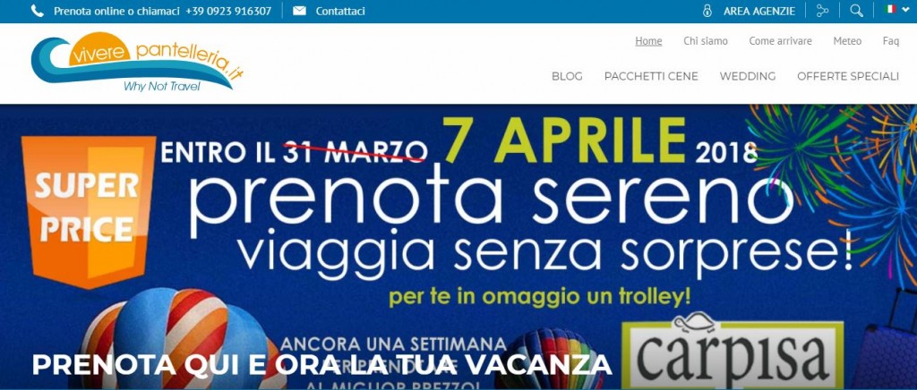 Un’altra settimana di promozioni in casa Vivere Pantelleria. L’operatore ha infatti prolungato fino al 7 aprile la promo “Prenota Sereno” che prevede, per una prenotazione di un pacchetto volo+dammuso+noleggio, l’omaggio di un trolley Carpisa.