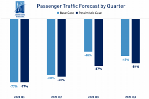 Volumi di traffico in netto calo rispetto al 2019: il risultato cambia poco, sia che si tratti della migliore o della peggiore delle ipotesi. Aci Europe ha aggiornato così le proprie previsioni per il traffico passeggeri del 2021, evidenziando come lo stesso rimarrà a “livelli bassi” nel primo e nel secondo trimestre, con una certa ripresa nel terzo trimestre, a condizione che le vaccinazioni vengano effettivamente introdotte in modo significativo e che le restrizioni di viaggio siano almeno parzialmente rimosse. Lo scenario intermedio di Aci Europe prevede quindi un calo del -40% del traffico nel terzo trimestre rispetto allo stesso periodo del 2019, con uno scenario più pessimistico che mostra un calo del -57%, qualora persistano le restrizioni di viaggio.