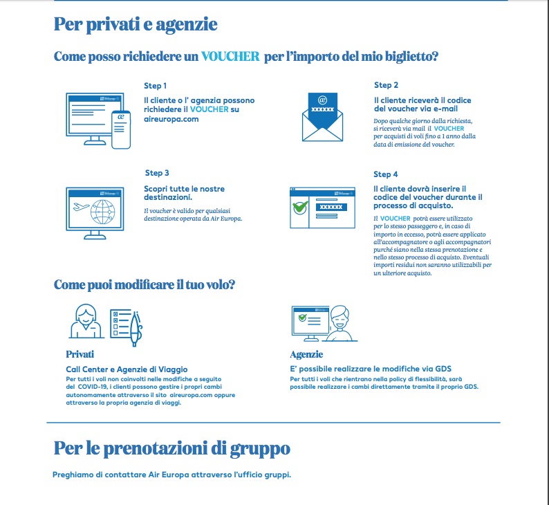 Nuova iniziativa di Air Europa per le agenzie di viaggio. Infatti, a causa della situazione causata dall’emergenza coronavirus e all’impatto che sta avendo sugli operativi, il vettore ha creato una landing page per le adv. Oltre alle informazioni aggiornate sullo stato dei voli, gli agenti troveranno anche comunicazioni utili sulle diverse alternative previste da Air Europa per i passeggeri, nonché le indicazioni su come richiedere i voucher o gestire le riemissioni.