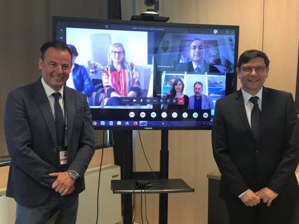 Da sinistra Michele Bufo e Salvatore Ombra; alle loro spalle, in collegamento da remoto Daniela Caruso, Michael Harrington, Silvia Ruscitto e Giancarlo Celani