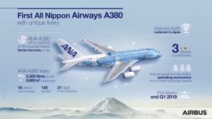 Ana riceverà il nuovo A380, il Flying Honu, nel marzo 2019 e il volo inaugurale in partenza dall’aeroporto internazionale di Tokyo Narita per il Daniel K. Inouye di Honolulu è previsto per il 24 maggio 2019.