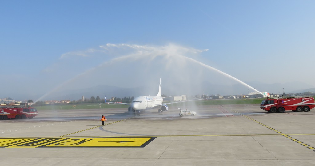 Blue Air ha inaugurato oggi, venerdì 31 marzo, la nuova rotta tra gli aeroporti di Liverpool e Milano Bergamo. Il Boeing 737-800 con la livrea dedicata alla città dei Beatles è atterrato alle 9:45 sulla pista dello scalo bergamasco, accolto da due automezzi super Dragon del Distaccamento aeroportuale di Orio al Serio dei Vigili del Fuoco, che hanno messo in scena il tradizionale “arc of triumph”. Per il Boeing 737-800 di Blue Air si tratta del debutto assoluto sullo scalo di Orio; il volo con Liverpool opera con frequenza quadrisettimanale (lunedì, mercoledì, venerdì e domenica).