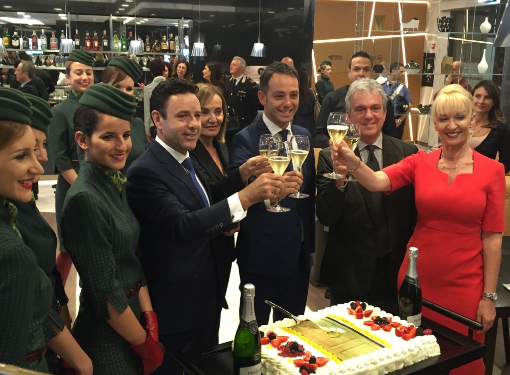 Al centro Cramer Ball, ad di Alitalia, durante l’inaugurazione della lounge Casa Alitalia a Milano Malpensa