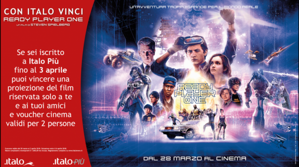 “Con Italo vinci Ready Player One”, infatti, è l’iniziativa di Italo, dedicata a tutti i passeggeri Italo iscritti al programma fedeltà Italo Più, che porta il viaggiatore al cinema!