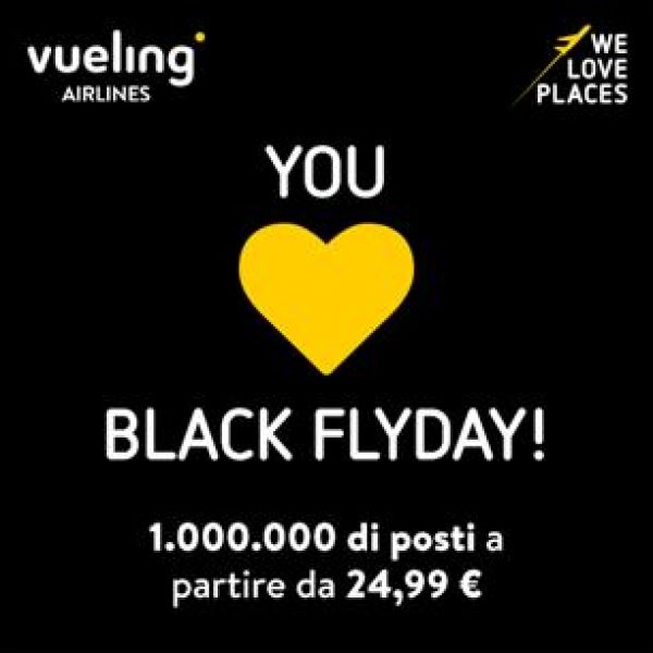 Vueling inaugura oggi il Black Flyday, la speciale promozione per tutti i passeggeri che acquisteranno un biglietto della compagnia aerea tra oggi e lunedì. Un milione di biglietti sono a disposizione dei clienti Vueling a partire da 24,99 euro per volare nel periodo compreso tra l’11 dicembre 2017 e il 20 giugno 2018: la promozione è valida presso gli aeroporti serviti dal vettore in Italia, sia sulle rotte domestiche che su quelle internazionali. Tra le occasioni da non perdere in questo Black Flyday, un weekend a Nizza raggiungibile dall’aeroporto di Roma Fiumicino a soli 27,99 euro, una vacanza alla scoperta di Barcellona con voli in decollo da Milano, Napoli, Torino, Olbia e Cagliari a 29,99 euro, o ancora un viaggio a Parigi (24,99 euro) e Amsterdam (34,99 euro) partendo da Milano Malpensa.