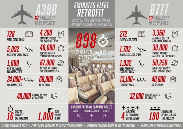 Emirates ha varato un fitto programma di ammodernamento di oltre 120 aeromobili con interni di ultima generazione, oltre a una serie di miglioramenti dei servizi in tutte le classi già da quest’anno. Un progetto ambizioso che prevede un investimento di oltre 2 miliardi di dollari.