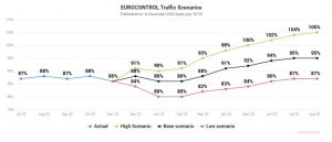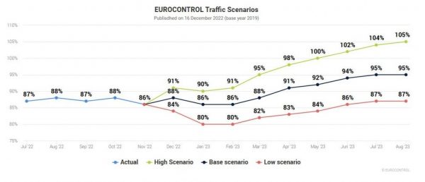 Questi scenari mensili aggiornano quelli evidenziati nell’aprile 2022 e riflettono le previsioni settennali 2022-2028 formulate in ottobre, che includevano una previsione di base per il 2023 pari al 92% del traffico del 2019 (10,2 milioni di voli).