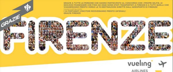 Vueling annuncia oggi l’estrazione dei 14 vincitori del concorso e dedica il particolare mosaico di foto “Grazie Firenze!” ai 500.000 passeggeri trasportati presso l’aeroporto fino ad ora e a tutte le persone che viaggeranno con Vueling verso le sue 15 destinazioni dirette disponibili dallo scalo toscano. Il messaggio “Grazie Firenze”, composto dai quasi 1.000 selfie inviati durante la scorsa settimana da tutti coloro che hanno partecipato al concorso, è stato pubblicato su La Nazione e sul sito www.graziefirenzevueling.it a testimonianza dell’importanza della città di Firenze e dei fiorentini nella strategia di crescita di Vueling in Italia. Vueling ha iniziato le sue operazioni presso l’Aeroporto di Firenze nel marzo 2012 con i primi collegamenti internazionali con Barcellona, Parigi e Madrid e in soli due anni è cresciuta molto sullo scalo toscano, fino ad arrivare a 500.000 passeggeri trasportati, un’offerta totale di 15 rotte dirette: 11 internazionali (Spalato, Mosca, Barcellona, Londra, Madrid, Berlino, Parigi, Copenaghen, Ibiza, Mykonos e Santorini), 4 rotte domestiche (Cagliari, Catania, Bari e Palermo) e un totale di 588.900 posti disponibili per la stagione estiva 2014, ovvero un incremento del 96% rispetto all’estate 2013. Ancora, l’inaugurazione della base operativa nel 2012, la seconda dopo Roma-Fiumicino e il lancio delle prime rotte domestiche nel 2013 che collegano Firenze con Catania, Cagliari, Bari e Palermo.