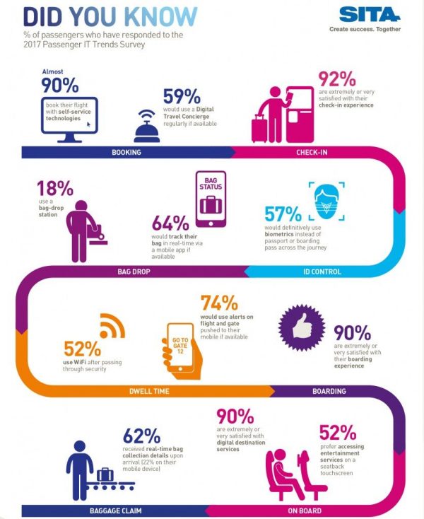 L’indagine di ita sottolinea che più i passeggeri imparano a usare la tecnologia durante il viaggio, più richiedono piattaforme nuove ed efficienti: cresce l’uso di siti web più intelligenti e ottimizzati per i dispositivi mobile per la prenotazione dei voli e il check-in. Strumenti chiave per la soddisfazione del passeggero sono i dispositivi mobile: lì i viaggiatori vogliono informazioni personalizzate sul volo, sul bagaglio, sul gate d’imbarco. Le app di compagnie aeree e aeroporti sono utilizzate invece per cercare nuovi servizi che aiutino a gestire meglio il viaggio. Forte è il desiderio di nuove opzioni tecnologiche: tre quarti (74%) dei passeggeri vorrebbero ricevere alert sul proprio volo e sul gate sui propri dispositivi mobile; il 57% userebbe volentieri app per orientarsi negli aeroporti; il 57% vorrebbe la biometria a ogni fase del percorso, per un viaggio senza intoppi.