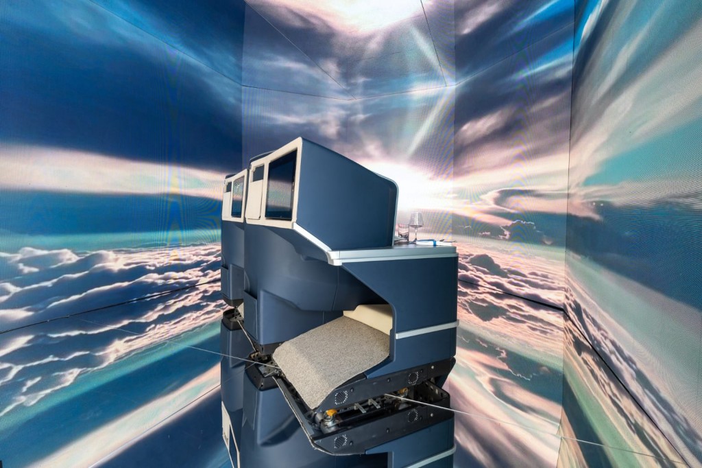 Nella seconda parte espositiva, il visitatore entra in un Caleidoscopio digitale dedicato all’Area Business. Al centro della scena è esposto e utilizzabile il mock-up della poltrona full flat Business dell’Airbus A330-900 del vettore. Immerso in un flusso di immagini digitali, il visitatore viene trasportato nel cielo in un viaggio mentre fa esperienza della comodità del servizio Ita.