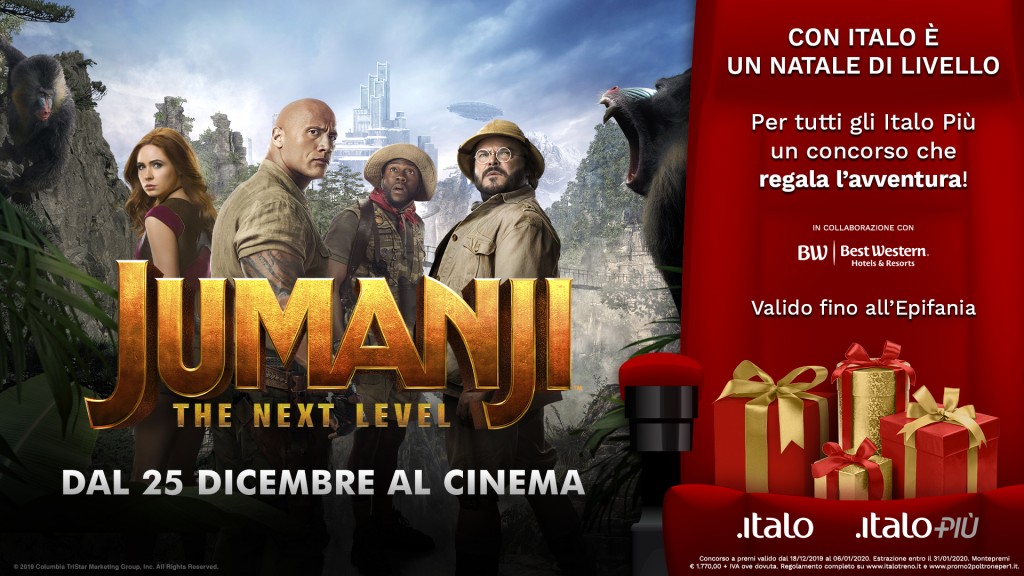 Il Natale di Italo porta con sé un regalo a tutti gli iscritti al programma fedeltà Italo Più. Torna infatti “2 poltrone per 1”, dando ai viaggiatori la possibilità di partecipare al contest “Con Italo è un Natale di livello” lanciato in occasione dell’uscita di Jumanji: The Next Level, nuovo episodio della fortunata saga Jumanji. Il film sarà nelle sale dal 25 dicembre ed Italo ha deciso di premiare la fedeltà dei suoi viaggiatori regalando al fortunato vincitore estratto una giornata di avventura mozzafiato al Jungle Adventure Park di San Zeno (in provincia di Verona), per concedersi una piacevole esperienza nella natura all’insegna del divertimento.