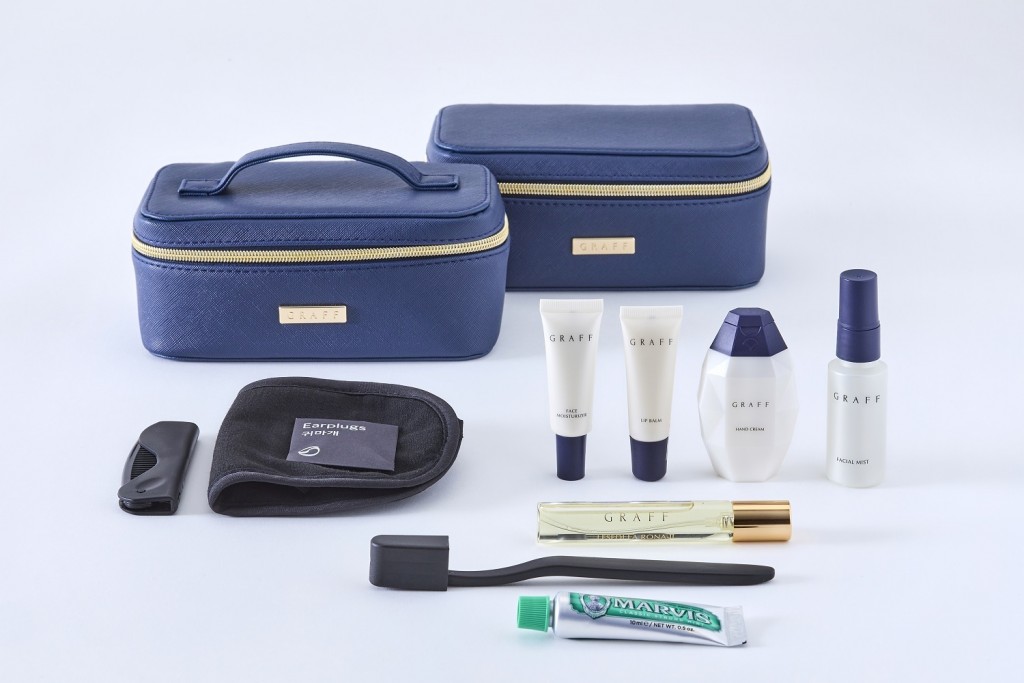 Gli amenity kit di classe premium, creati in collaborazione esclusiva con il marchio di lusso britannico Graff, consistono in eleganti sacchetti contenenti prodotti per la cura della pelle e profumi.