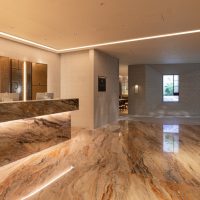 Con una superficie di 2.615 metri quadrati e oltre 420 posti a sedere, la Prestige Class West Lounge è la più grande lounge di Incheon. Il design rispecchia l’identità di marca delle cabine premium di Korean Air, utilizzando una palette di colori che spazia dall’oro al nero e all’avorio.