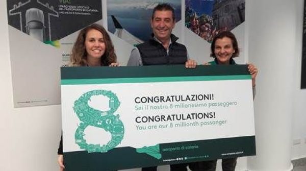 L’aeroporto di Catania ha raggiunto oggi gli 8 milioni di passeggeri transitati nel corso dell’anno: un traguardo preceduto dai record di presenze estivi (un milione e 15 mila utenti nel solo mese di agosto). L’8 milionesimo passeggero viaggiava sul volo Catania-Barcellona operato da Vueling, compagnia aerea operativa a Fontanarossa dal 2013. Per festeggiare il traguardo, la compagnia aerea ha donato due biglietti per Barcellona, Roma Fiumicino o Firenze a Giorgio Buscema, 55 anni, ex sovrintendente capo della Questura di Siracusa, in pensione da un anno. Daniela Baglieri e Nico Torrisi, presidente e amministratore delegato di Sac, commentano: «E’ un traguardo importante, propedeutico a quello dei 9 milioni di passeggeri che contiamo di raggiungere sotto le festività natalizie, secondo le previsioni dei nostri analisti. Un tasso di crescita costante che ci impone funzionali investimenti in air side e in land side per migliorare ulteriormente gli standard dei servizi. Gestire il transito di 8 milioni di passeggeri in poco più di dieci mesi e senza grandi scossoni – considerando che questa infrastruttura, inaugurata 10 anni fa era stata progettata per 5 milioni di passeggeri – è stato un lavoro impegnativo».