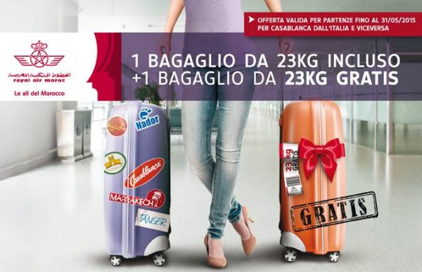 Royal Air Maroc lancia una nuova promozione bagaglio per i passeggeri diretti a Casablanca. A partire dal 21 marzo e fino al 31 maggio 2015, sarà possibile imbarcare un bagaglio extra gratuito da 23 kg, oltre la normale franchigia prevista, sui voli con destinazione finale Casablanca in partenza dall’Italia e viceversa. I clienti per e da Casablanca di Royal Air Maroc avranno diritto a 2 pezzi di bagaglio in classe economica e 3 pezzi in business class. La franchigia speciale é stata introdotta nei gds a partire dal 21 marzo 2015 e ne consegue che i biglietti riporteranno automaticamente il numero di pezzi corretto in base ai parametri sopra indicati. La promozione non ha effetto retroattivo e per i biglietti emessi precedentemente al 21 marzo verrà applicata la normale franchigia bagaglio di un pezzo da 23 kg come indicato sul documento di viaggio.