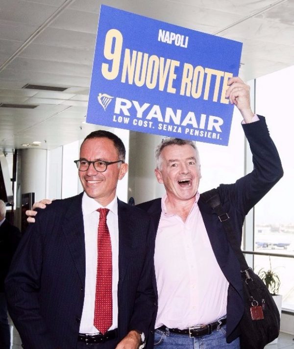 A Napoli, Michael O’Leary, ceo di Ryanair ha affermato: «Per celebrare il lancio della programmazione estiva 2018 da Napoli, stiamo mettendo in vendita biglietti con tariffe a partire da 16,99 euro per viaggiare da settembre a novembre e prenotabili fino alla mezzanotte di venerdì (8 settembre)». E Armando Brunini (nella foto con O’ Leary), amministratore delegato Gesac spa, ha aggiunto: «Dall’inizio dell’anno il traffico passeggeri dell’aeroporto di Napoli è cresciuto di un impressionante 23%, più di tre volte la media nazionale, e senz’altro l’ingresso di Ryanair con una loro base è stato determinante per raggiungere questo risultato. Per noi è altrettanto importante, però, che anche la maggior parte delle altre compagnie operanti sullo scalo siano notevolmente cresciute e stiano contribuendo a determinare un altro anno da record. Nei mesi di luglio ed agosto è stato infatti raggiunto il record storico di traffico dell’aeroporto, con oltre un milione di passeggeri registrati per mese. Il fatto, poi, che Ryanair decida di continuare ad investire sullo scalo è per noi motivo di soddisfazione e dimostra che il mercato di Napoli e della Campania ha ancora del potenziale da poter esprimere».