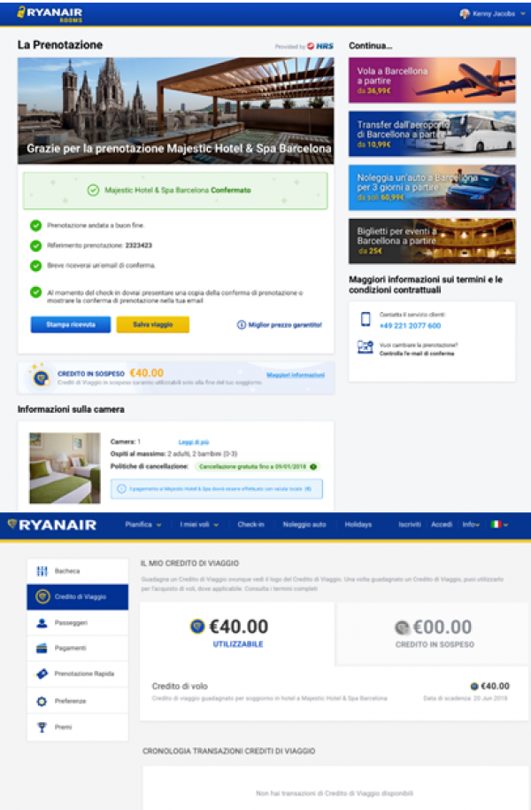 Ad esempio, un cliente che prenota un soggiorno di 4 notti a Barcellona spendendo €400 riceverà €40 di “Credito di Viaggio” direttamente sul suo profilo MyRyanair. La compagnia ha di recente aggiornato Ryanair Rooms con una scelta ancora più ampia di hotel, ostelli, bed & breakfast, ville e case-vacanza, con oltre 1,2 milioni di camere in tutto il mondo.