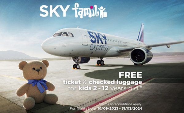 Sky express promuove il viaggio in famiglia con una speciale offerta che prevede il volo gratuito per i bambini. Il programma Sky Family propone infatti un biglietto gratis dedicato ai bambini dai 2 ai 12 anni e, ai genitori, un bagaglio di 15 kg gratuito.