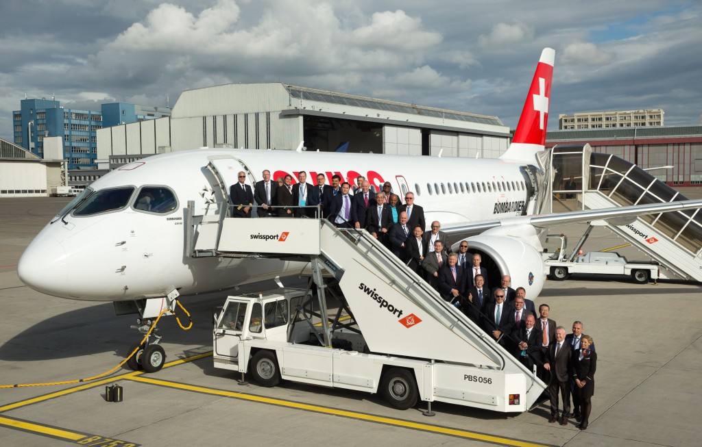 Il nuovo Bombardier CS 100 di Swiss con i ceo di Star Alliance, riuniti a Zurigo per l’annuale board meeting