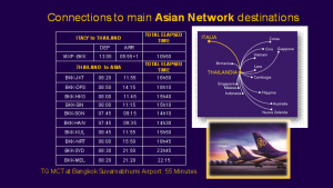 Si vola in Thailandia con un collegamento diretto da Milano Malpensa e, dall’hub di Bangkok, è poi possibile accedere alle connessioni verso tutta l’Asia, l’Australia, oltre che in Indocina, Vietnam, Cambogia e Laos, che è una zona di estremo interesse per il mercato italiano – sottolinea Mauro Sassano, senior supervisor sales department Thai Airways -. L’operativo attualmente in vigore dall’Italia è il giornaliero Malpensa-Bangkok, che parte alle 13:05 per arrivare il mattino dopo alle 5:55, in 10h di volo. Si torna partendo alle 00:35 per arrivare alle 7:10 a Malpensa.