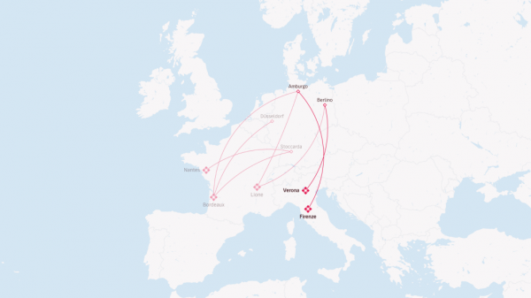 Volotea ed Eurowings hanno siglato un protocollo d’intesa che porterà ad un accordo di vendita reciproco su oltre 140 rotte chiave operate da entrambe le compagnie, più di 100 da Eurowings e circa 40 da Volotea, senza alcuna sovrapposizione. Questi collegamenti comprenderanno 8 nuove rotte gestite da Volotea da/per la Germania, connettendo direttamente Berlino, Düsseldorf, Stoccarda e Amburgo con le sue basi di Bordeaux, Lione e Nantes e Firenze e Verona (e precisamente Verona-Berlino, operativa dal 26 maggio e Firenze-Amburgo, attiva dal 10 ottobre). Queste nuove rotte avranno 2 frequenze settimanali con una capacità di circa 60.000 posti.