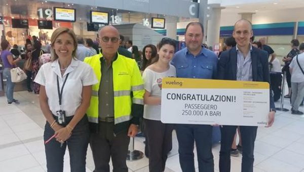 Vueling raggiunge un’importante traguardo trasportando il suo 250.000° passeggero presso l’Aeroporto di Bari, che è stato festeggiato con il regalo di due biglietti omaggio per viaggiare nuovamente con la compagnia aerea. La low cost spagnola ha iniziato ad operare dall’aeroporto di Bari nell’estate 2013 e quattro anni dopo, per l’estate 2017, la compagnia aerea offre il collegamento con Barcellona El Prat, principale hub internazionale di Vueling, con più di 33.000 posti disponibili e fino a 5 frequenze settimanali. Inoltre, proprio grazie al collegamento con l’aeroporto di Barcellona El Prat i passeggeri in partenza da Bari potranno usufruire all’esclusivo servizio Vueling-to-Vueling dei voli in connessione, che permette ai passeggeri di fare un unico check-in all’aeroporto di partenza e di ritirare comodamente i bagagli all’arrivo. Con questo servizio, i passeggeri in partenza da Bari potranno raggiungere via Barcellona mete come Ibiza, Siviglia, le Isole Canarie, Malaga e molte altre, grazie ad un’offerta di più di 135 destinazioni servite dalla compagnia in tutta Europa, Africa e Medio Oriente.