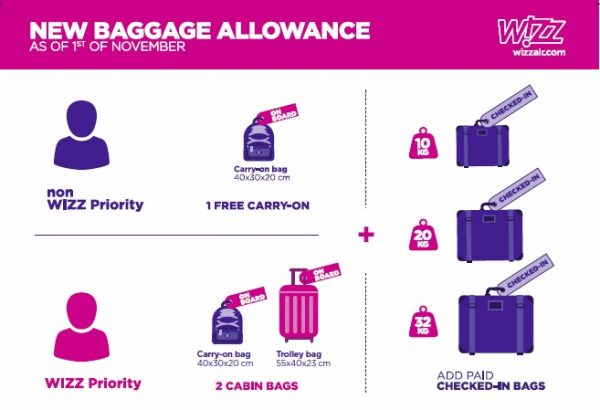 A partire dal 1 novembre, ogni passeggero potrà portare gratuitamente a bordo una borsa (40x30x20 cm), mentre i passeggeri che acquistano la WIZZ Priority potranno portare in cabina un trolley (55x40x23 cm). Sulla base del feedback dei passeggeri e del diverso modo di viaggiare, Wizz Air ha introdotto un bagaglio da imbarcare del peso di 10kg con tariffe basse a partire da €7 per rendere più confortevole l’esperienza di viaggio.